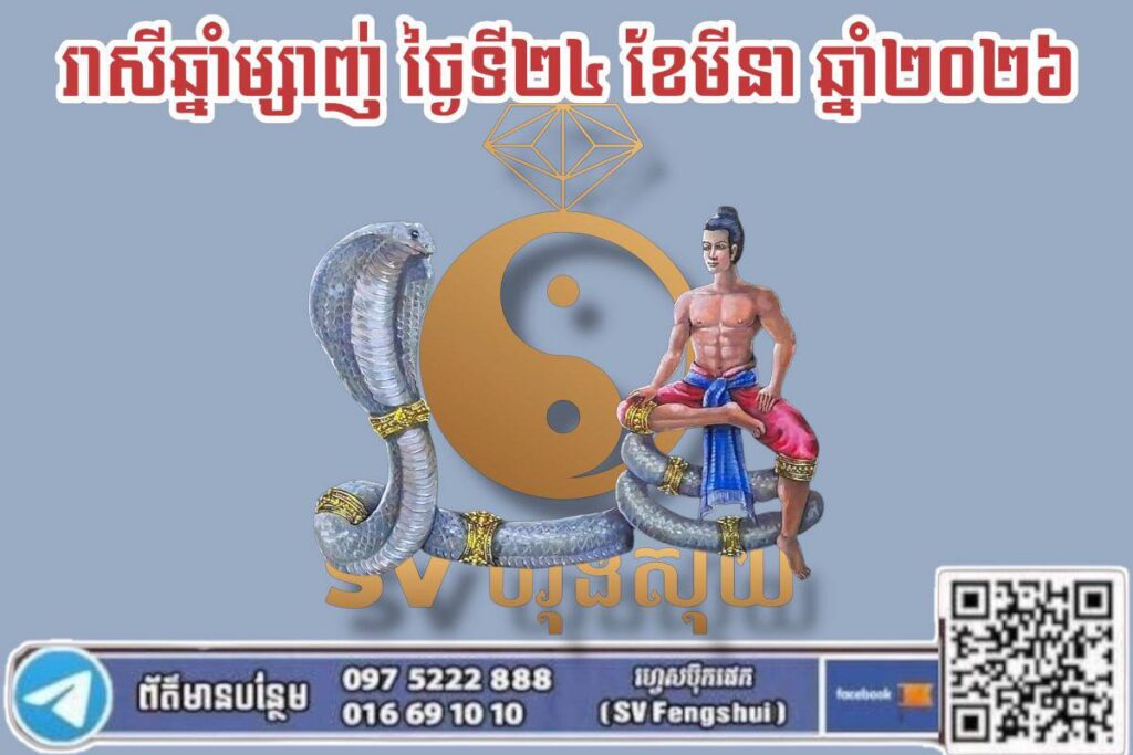 ការងារ និងអាជីវកម្ម៖ រាល់ការងារដែលលោកអ្នកបានខិតខំប្រឹងប្រែងពីមុនមក នឹងចាប់ផ្តើមហុចផលឱ្យឃើញនៅថ្ងៃនេះ។ លោកអ្នកនឹងមានបញ្ញាស្មារតីវាងវៃក្នុងការដោះស្រាយបញ្ហាប្រឈមនានា។ សម្រាប់អ្នកប្រកបរបររកស៊ីជួញដូរ នឹងមានអតិថិជនជឿជាក់ និងគាំទ្រច្រើន ដែលនាំឱ្យមុខរបរកាន់តែរីកចម្រើន។