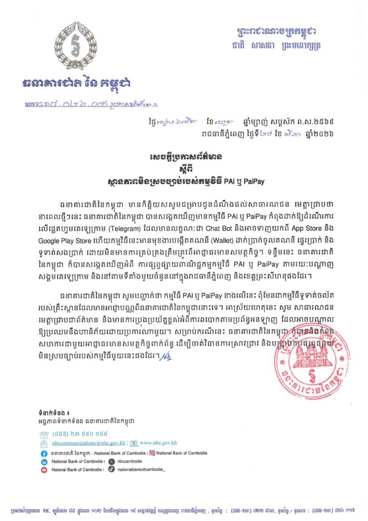រាជធានីភ្នំពេញ ៖ ធគារជាតិ នៃកម្ពុជានៅថ្ងៃទី២៥ ខែមីនា ឆ្នាំ២០២៦ បានចេញសេចក្ដីប្រកាសព័ត៌មានស្តីពីស្ថានភាពមិនស្របច្បាប់របស់កម្មវិធី PAI ឬ PalPay។