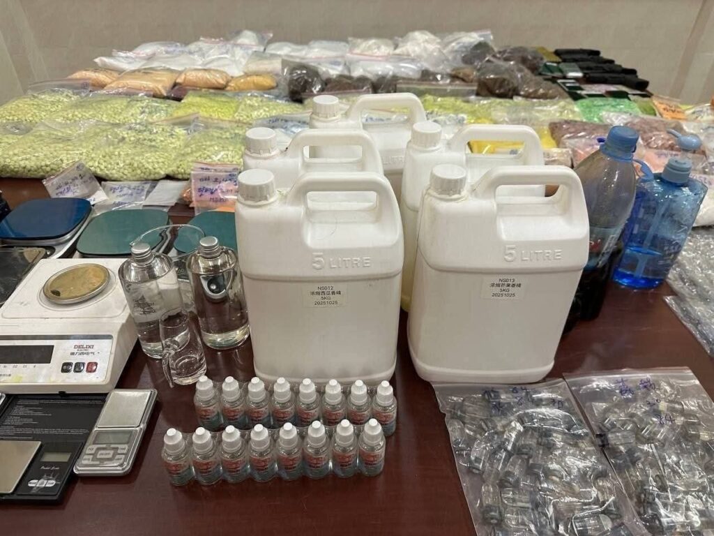 ថ្នាំញៀនប្រភេទMDMAម្សៅម៉ត់ ទម្ងន់៧២៧,០៨ក្រាម ថ្នាំញៀនប្រភេទហេរ៉ូអុីន ទម្ងន់៤គីឡូ៣២៨,០៧ក្រាម ប្រភេទនីមេតាហ្សេប៉ាម ទម្ងន់១គីឡូ៤៨៣,៥៩ក្រាម ជ័រអាអាភៀនទម្ងន់ ៨គីឡូ៨១១,៦៤ក្រាម ថ្នាំញៀនកញ្ចប់ពណ៌ទឹកក្រូចអក្សរCHALI ចំនួន១២កញ្ចប់ ថ្នាំញៀនកញ្ចប់ពណ៌លឿងរូបយុឹនសឹន ចំនួន២០កញ្ចប់ បារីអេឡិចត្រូនិច ចំនួន៣កេស ក្បាលបារីជក់អេឡិចត្រូនិច ចំនួន៤កកេស