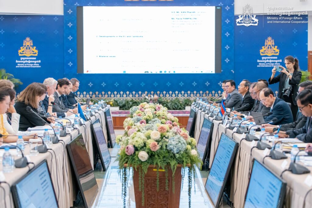 នៅរសៀលថ្ងៃទី២៦ ខែមីនា ឆ្នាំ២០២៦ នៅទីស្តីការក្រសួង ឯកឧត្តម កាន់ ផារិទ្ធ រដ្ឋលេខាធិការនៃក្រសួងការបរទេស និងសហប្រតិបត្តិការអន្តរជាតិ និង លោកស្រី Paola Pampaloni នាយិការងនៃមន្ទីរការបរទេស សហភាពអឺរ៉ុប បានធ្វើជាសហប្រធានដឹកនាំកិច្ចប្រជុំពេញអង្គគណៈកម្មាធិការចម្រុះកម្ពុជា-សហភាពអឺរ៉ុបលើកទី១៣ ដែលត្រូវធ្វើឡើងជារៀងរាល់២ឆ្នាំម្តង។ កិច្ចប្រជុំនេះមានការអញ្ជើញចូលរួមពីតំណាងក្រសួង-ស្ថាប័នពាក់ព័ន្ធកម្ពុជាសំខាន់ៗ និងតំណាងរបស់ភាគី EU ដែលមកពីអគ្គនាយកដ្ឋានពាក់ព័ន្ធរបស់គណៈកម្មការអឺរ៉ុប និងពីស្ថានទូតនៃប្រទេសសមាជិក EU។