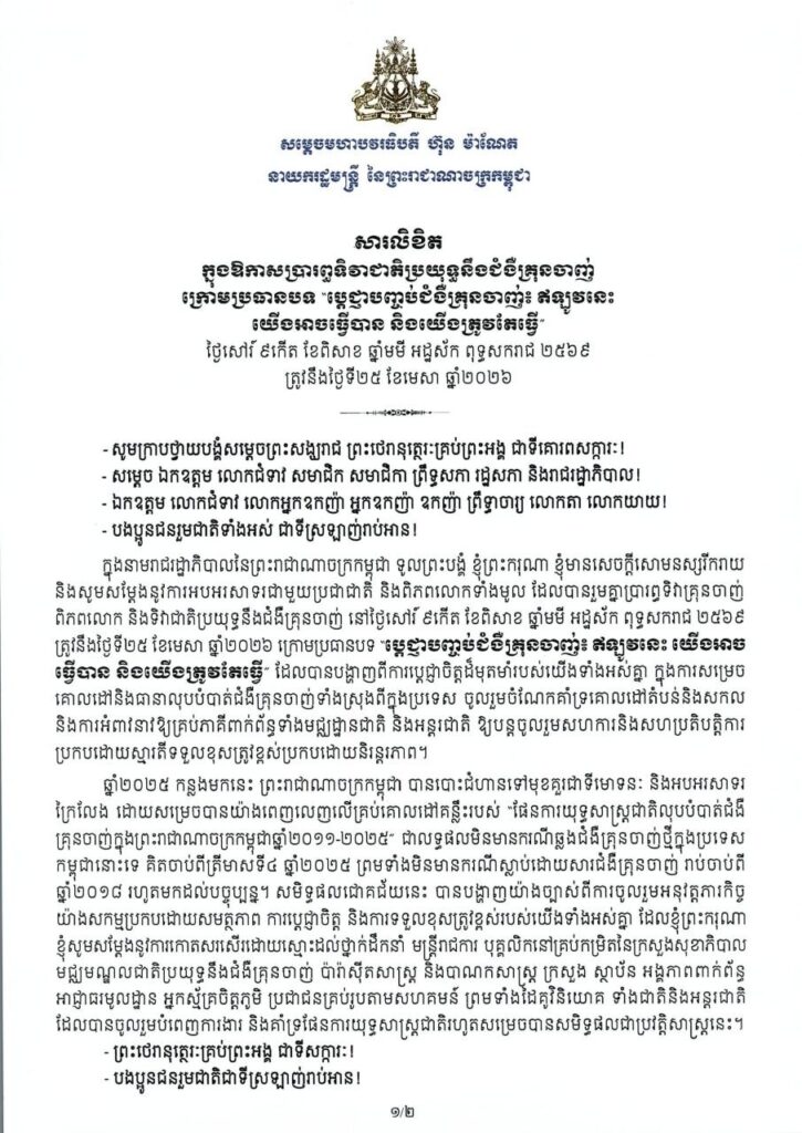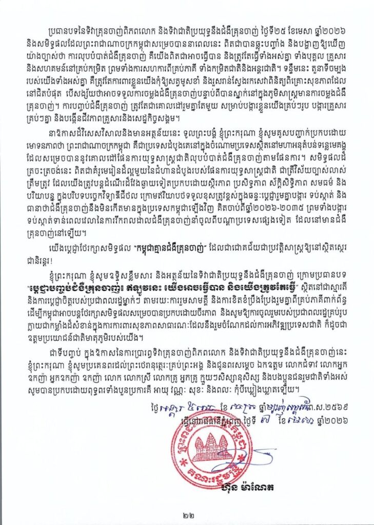 សម្តេចមហាបចធិបតី ហ៊ុន ម៉ាណែត បានមានប្រសាសន៍ថា ក្នុងនាមរាជរដ្ឋាភិបាលនៃព្រះរាជាណាចក្រកម្ពុជា ទូលព្រះបង្គំ ខ្ញុំព្រះករុណា ខ្ញុំមានសេចក្តីសោមនស្សរីករាយ និងសូមសម្តែងនូវការអបអរសាទរជាមួយប្រជាជាតិ និងពិភពលោកទាំងមូល ដែលបានរួមគ្នាប្រារព្ធទិវាគ្រុនចាញ់ ពិភពលោក និងទិវាជាតិប្រយុទ្ធនឹងជំងឺគ្រុនចាញ់ នៅថ្ងៃសៅរ៍ ៩កើត ខែពិសាខ ឆ្នាំមមី អដ្ឋស័ក ពុទ្ធសករាជ ២៥៦៩ ត្រូវនឹងថ្ងៃទី២៥ ខែមេសា ឆ្នាំ២០២៦ ក្រោមប្រធានបទ “ប្តេជ្ញាបញ្ចប់ជំងឺគ្រុនចាញ់៖ ឥឡូវនេះ យើងអាច ធ្វើបាន និងយើងត្រូវតែធ្វើ” ដែលបានបង្ហាញពីការប្តេជ្ញាចិត្តដ៏មុតមាំរបស់យើងទាំងអស់គ្នា ក្នុងការសម្រេច គោលដៅនិងធានាលុបបំបាត់ជំងឺគ្រុនចាញ់ទាំងស្រុងពីក្នុងប្រទេស ចូលរួមចំណែកគាំទ្រគោលដៅតំបន់និងសកល និងការអំពាវនាវឱ្យគ្រប់ភាគីពាក់ព័ន្ធទាំងមជ្ឈដ្ឋានជាតិ និងអន្តរជាតិ ឱ្យបន្តចូលរួមសហការនិងសហប្រតិបត្តិការ ប្រកបដោយស្មារតីទទួលខុសត្រូវខ្ពស់ប្រកបដោយនិរន្តរភាព។
