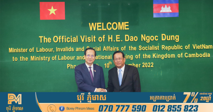 ភ្នំពេញ៖ ឯកឧត្តមបណ្ឌិត អ៉ិត សំហេង រដ្ឋមន្ត្រីក្រសួងការងារ និងបណ្តុះបណ្តាលវិជ្ជាជីវៈ បានទទួលជួបពិភាក្សាការងារជាមួយឯកឧត្តម Dao Ngoc Dung រដ្ឋមន្ត្រីក្រសួងការងារ ជនពិការ និងសង្គមកិច្ច នៃសាធារណរដ្ឋសង្គមនិយមវៀតណាម នារសៀលថ្ងៃទី១០ ខែវិច្ឆិកា ឆ្នាំ២០២២ នៅទីស្តីការក្រសួងការងារ។