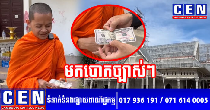 ព្រះសង្ឃខាងលើបន្តថា ជនបោកប្រាស់ប្តីប្រពន្ធ បានប្រាប់លោកថា ពួកគេទើបមកដកលុយពីធនាគារ អត់មានលុយរាយទេ គឺមានតែក្រដាសដុល្លារធំៗ។ បន្ទាប់មក ពួកគេបានដកលុយដុល្លារក្លែងក្លាយក្រដាស 50 មកដាក់លើជើងពាន ហើយលោកអាប់យកលុយខ្មែរវិញ 20$ ។ ប៉ុន្តែ ដោយសារលោកអត់លុយ មានតែ ៦ ម៉ឺន ពួកគេក៏ទទួលយកឡើងជិះម៉ូតូចាកចេញបាត់ ដោយពុំបានស្រោចទឹកអ្វីនោះទេ។