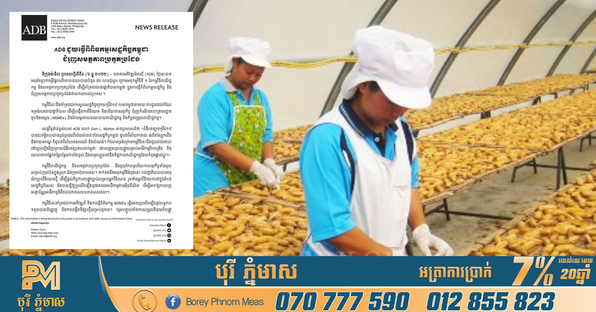 ភ្នំពេញ៖ យោងតាមសេចក្តីប្រកាសព័ត៌មានរបស់ ធនាគារអភិវឌ្ឍន៍អាស៊ី ADB ចេញផ្សាយនៅថ្ងៃទី ៦ខែធ្នូ ឆ្នាំ ២០២២នេះ បានឲ្យដឹងថា ដើម្បីគាំទ្រដល់រាជរដ្ឋាភិបាលកម្ពុជា ក្នុងការធ្វើពិពិធកម្មសេដ្ឋកិច្ច និងជំរុញសមត្ថ ភាពប្រកួតប្រជែងជាសកលរបស់ប្រទេស នៅថ្ងៃនេះ ធនាគារអភិវឌ្ឍន៍អាស៊ី (ADB) បានអនុម័តប្រាក់កម្ចីផ្អែកលើគោលនយោ បាយចំនួន ៥០លានដុល្លារ សម្រាប់កម្មវិធីពាណិជ្ជកម្ម និងសមត្ថភាពប្រកួតប្រជែង ។