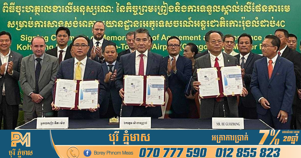 ភ្នំពេញ៖ រាជរដ្ឋាភិបាលកម្ពុជា និងផ្នែកឯកជន បានចុះហត្ថលេខាលើកិច្ចព្រមព្រៀង និងអនុម័តប្លង់មេសាង សង់អាកាសយានដ្ឋានអេកូទេសចរណ៍អន្តរជាតិកោះរ៉ុង លំដាប់ 4C នេះ ដោយមានអញ្ជើញចូលរួមចុះហត្ថលេខារវាងឯកឧត្តម ម៉ៅ ហាវណ្ណាល់រដ្ឋលេខាធិការដ្ឋានអាកាសចរស៊ីវិលកម្ពុជា និងអ្នកឧកញ៉ា គិត ម៉េង ក្រុមហ៊ុន រ៉ូយ៉ាល់ គ្រុប កោះរ៉ុង ឌីវីឡបមេន ខមផេនី។