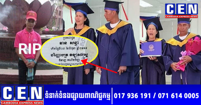 ថ្មីៗនេះ រូបភាព២សន្លឹក បង្ហាញឪពុកម្តាយវ័យចំណាស់មួយគូ ទៅទទួលសញ្ញាប័ត្រ ជំនួសកូនប្រុសជាទីស្រលាញ់ ដែលបានបាត់បង់ជីវិត បានកំពុងអង្រួនបេះដូងមហាជន ឲ្យរំជួលចិត្ត និងសោកស្រណោះជាពន់ពេកក្រៃ។