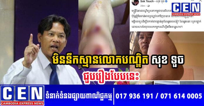 ថ្មីៗនេះ មហាជននៅលើបណ្តាញសង្គម ពិតជាមានការភ្ញាក់ផ្អើលយ៉ាងខ្លាំង ខណៈបានឃើញលោកបណ្ឌិត សុខ ទូច នៅសុខៗ ស្រាប់តែបានបង្ហោះរូបភាពចូលមន្ទីរពេទ្យ វះកាត់ដៃឆ្វេងជាបន្ទាន់ បន្ទាប់ពីបង្ហាញរបួសដៃជើងយ៉ាងដំណំ ដោយសារចុះបេសកម្មករណីរឿងបឹងទន្លេសាប។