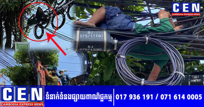 លុះព្រឹកឡើង ប្រជាពលរដ្ឋភ្ញាក់ពីព្រលឹម ឃើញបុរសម្នាក់ កំពុងដេកមិនលក់នៅលើខ្សែភ្លើង ស្មានថាស្លាប់បាត់ទៅហើយ ក៏ប្រញាប់រាយការណ៍ប្រាប់សមត្ថកិច្ច។