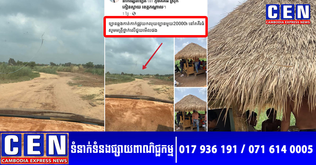 នេះបើតាមគណនីហ្វេសប៊ុកឈ្មោះ ស៊ីម ទី បានបង្ហាញរូបភាព និងបញ្ជាក់ឲ្យដឹងថា គ្រាន់តែឡានបើកឆ្លងកាត់តាមផ្លូវលំមួយនេះ គឺមានប៉ុស្តិ៍អ្នកកាន់ច្រកត្រឹមត្រូវ កាក់ផ្លូវឲ្យបង់ចំនួន ២០០០០៛ នៅភូមិគគីធំ ស្រុកកៀនស្វាយ ខេត្តកណ្តាល។