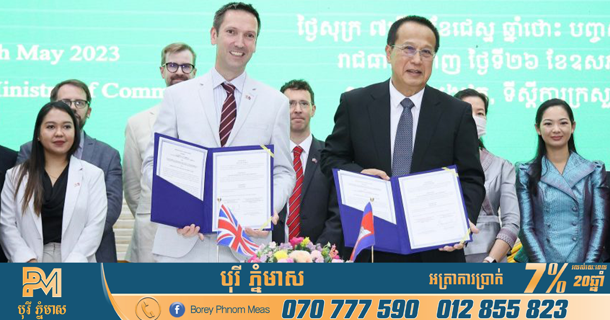 ភ្នំពេញ៖ ភាគីកម្ពុជា-អង់គ្លេស បានចុះហត្ថលេខារួមគ្នា លើអនុស្សរណៈយោគយល់គ្នាស្ដីពីការបង្កើតវេទិកាពាណិជ្ជកម្ម និងវិនិយោគរួមគ្នា និងរៀបចំវេទិកានេះជាលើកទីមួយ នៅថ្ងៃទី២៦ ខែឧសភា ឆ្នាំ២០២៣ រវាងឯកឧត្តម ប៉ាន សូរស័ក្តិ រដ្ឋមន្រ្តីក្រសួងពាណិជ្ជកម្មកម្ពុជា និងលោក ដូមីនិក វីលៀម (Dominic Williams) ឯកអគ្គរាជទូតចក្រភពអង់គ្លេស។