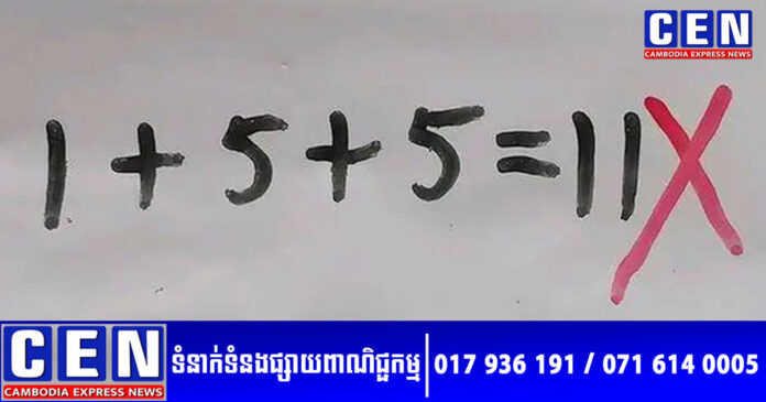 សំណួរនេះហាក់ដូចជាមិនពិបាកទេ កុមារបន្ទាប់ពីមើលយ៉ាងដិតដល់ បានផ្តល់ចម្លើយ៖ 1+5+5=11 បានសរសេរវាចូល ហើយបង្ហាញវាដល់ឪពុករបស់គាត់។ ឪពុកពិនិត្យមើល គិតថាកូនធ្វើបានត្រឹមត្រូវ ហើយសរសើរភាពឆ្លាតវៃរបស់កូនជាខ្លាំង។
