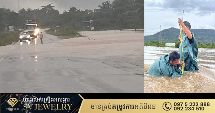ព្រះសីហនុ៖ ស្ថានភាពកម្ពស់ទឹកនៅចំណុចស្ពានស្ទឹងសំរោងចន្លោះគីឡូម៉ែត្រលេខ 115-116 ក្នុងភូមិសាស្ត្រ ភូមិស្ទឹងសំរោង ឃុំអូរបាក់រទេះ ស្រុកកំពង់សីលា ខេត្តព្រះសីហនុ ជំនន់ទឹកភ្លៀងបានហក់ឡើងដល់កម្ពស់ ៦,៥០ ម៉ែត្រ ពីបាតស្ទឹង កំពស់លើផ្លូវជាតិ ៦,៨០ ម៉ែត្រ ហូរកាត់តាមបណ្តោយផ្លូវជាតិប្រហែល៤១០ម៉ែត្រ។