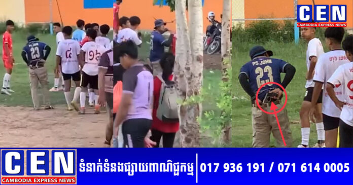 វីដេអូ និងរូបភាព បង្ហាញបុរសម្នាក់ដកសម្ញែងកាំភ្លើងខ្លី នៅកន្លែងលេងបាល់ទាត់ និងពាក្យបណ្តឹង១សន្លឹក ពីខាងភាគីអ្នកដឹកនាំកីឡាករជាជនរងគ្រោះ បានកំពុងត្រូវបានចែកចាយ ក្នុងបណ្ដាញសង្គមហ្វេសប៊ុក ធ្វើឲ្យមានការភ្ញាក់ផ្អើលយ៉ាងខ្លាំង។