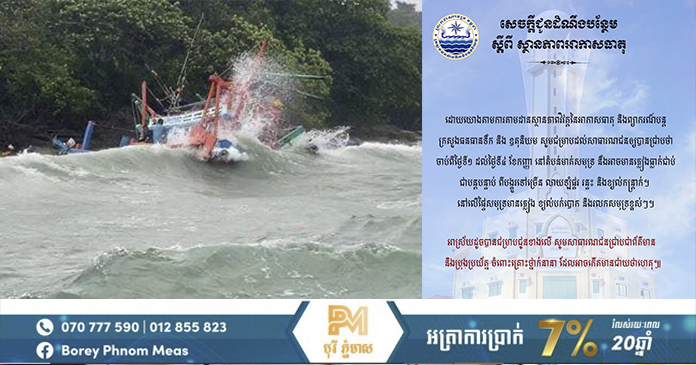 ភ្នំពេញ ៖ ចាប់ពីថ្ងៃទី១- ៤ ខែកញ្ញា ក្រសួងធនធានទឹកនិងឧតុនិយម បានប្រកាស ពីស្ថានភាពអាកាសធាតុ តំបន់មាត់សមុទ្រ អាចមាន ភ្លៀងធ្លាក់ពីបង្គួរទៅច្រើន និងមានខ្យល់បោកបក់ខ្លាំង រលកសមុទ្រខ្ពស់ៗ សូមពលរដ្ឋដែលរស់នៅតំបន់នេះមានការប្រុងប្រយ័ត្នខ្ពស់ ។