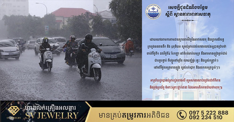 ភ្នំពេញ៖ ក្រសួងធនធានទឹក និងឧតុនិយម នៅថ្ងៃទី១ ខែកញ្ញា ឆ្នាំ២០២៣ បានចេញសេចក្តីជូនដំណឹង បន្ថែមស្តីពីស្ថានភាពអាកាសធាតុនៅកម្ពុជា ដោយចាប់ពីថ្ងៃទី១ ដល់ថ្ងៃទី៤ ខែកញ្ញា តំបន់មាត់សមុទ្រ អាចមានភ្លៀងធ្លាក់ពីបង្គួរទៅច្រើន ខ្យល់បោកបក់ រលកសមុទ្រខ្ពស់ សូមប្រុងប្រយ័ត្ន ។