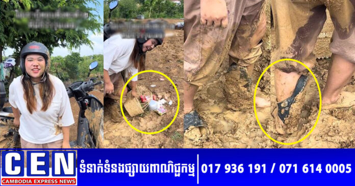 បង្ហោះនៅលើគណនី TikTok របស់ខ្លួន នារីដ៏កំប្លែងរូបនេះ បានរៀបរាប់ដោយដឹងថា៖ «កំពុងជិះម៉ូតូទៅធ្វើបុណ្យនៅវត្ត មេឃភ្លៀង ផ្លូវរអិល ដួលប្រឡាក់ភក់ពេញខ្លួនប្រាណគ្មានសល់ទេ» និងព្រមទាំងភ្ជាប់ Caption ពាក្យមួយឃ្លាយ៉ាងចាក់ដោតថា «ថ្ងៃវិសាខបូជានេះ សូមទៅព្យាបាលរបួសមុនហើយ លោកយាយលោកតាអើយ!»។
