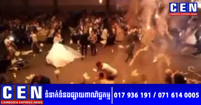 ខ្សែវីដេអូដ៏រន្ធត់មួយ បានបង្ហាញពីទិដ្ឋភាពខណៈពេលដែលកូនកំលោះ និងកូនក្រមុំ កំពុងឱបគ្នា ស្រាប់តែភ្លាមៗនោះ បំណែកដុំភ្លើងដែលឆេះសន្ធោសន្ធៅ បានធ្លាក់ពីលើដំបូលជាបន្តបន្ទាប់ ហើយភ្ញៀវនៅកន្លែងកើតហេតុ បានរត់គេចចេញទាំងអ្នកខ្លះត្រូវរលាកភ្លើង។