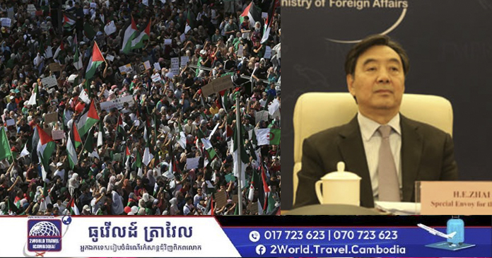 រដ្ឋធានីគៀរ៖ ប្រេសិតរបស់ប្រទេសចិន ប្រចាំនៅតំបន់មជ្ឈិមបូព៌ា បានអះអាង អំពីការប្រើប្រាស់កម្លាំងយោធា នឹងមិនមែនជាមធ្យោបាយ សម្រាប់ដោះស្រាយជម្លោះ រវាងអ៊ីស្រាអែល-ប៉ាឡេស្ទីន ក្រោយការផ្ទុះសង្គ្រាម ចាប់តាំងពីថ្ងៃទី៧ ខែតុលា រហូតមក ហើយជម្លោះនេះ បានសម្លាប់ជនជាតិអ៊ីស្រាអែល យ៉ាងតិច ១៤០០នាក់ និង បានសម្លាប់ជនជាតិប៉ាឡេស្ទីន យ៉ាងតិច ៤ ៥០០នាក់។