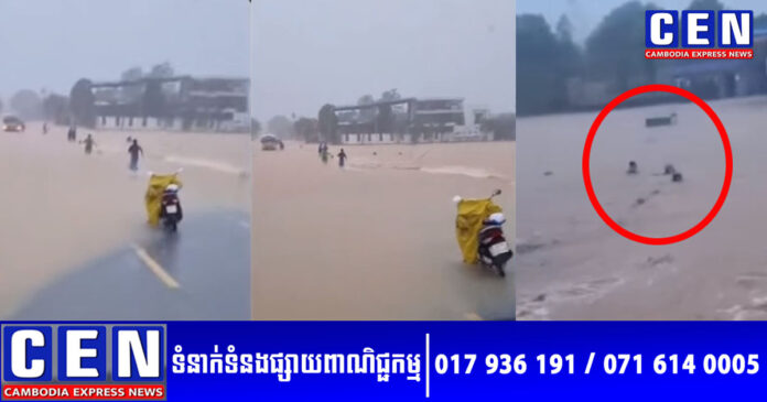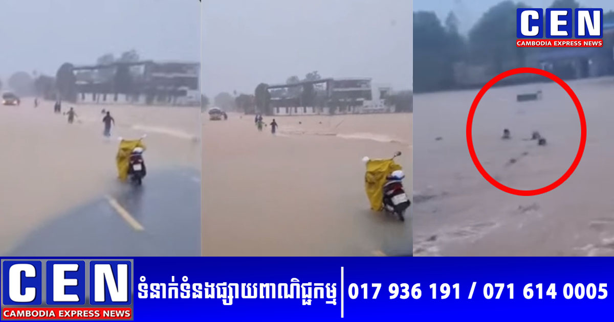 នេះជាខណៈពេលដ៏រន្ធត់ណាស់ នៅពេលដែលបានឃើញអ្នកដំណើរតាមម៉ូតូ ត្រូវបានទឹកជំនន់ហូរនាំយកចេញពីផ្លូវ និងកំពុងតស៊ូជីវិតនៅក្នុងទឹកដ៏ល្ហល្ហេវ ស្របពេលដែលមានអ្នកដំណើរល្អៗ បាននាំគ្នារត់ទៅជួយ ដោយមិនគិតពីគ្រោះថ្នាក់។