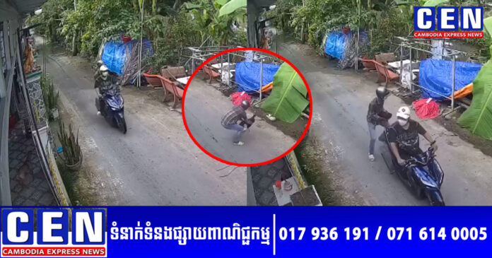 ជាក់ស្តែង នៅពេលមកដល់ចំណុចផ្ទះប្រជាពលរដ្ឋ ដែលមានចិញ្ចឹមមាន់នៅសងខាងផ្លូវ ស្រាប់តែមានចោរម្នាក់ ក្នុងចំណោម២នាក់ បានលោតចុះពីម៉ូតូ ហើយមិនពិបាកក្នុងការចាប់មាន់គក១ក្បាល ដែលកំពុងស្ថិតនៅចិញ្ចើមផ្លូវ ហើយរត់គេចខ្លួនយ៉ាងលឿនដោយសុវត្ថិភាព។