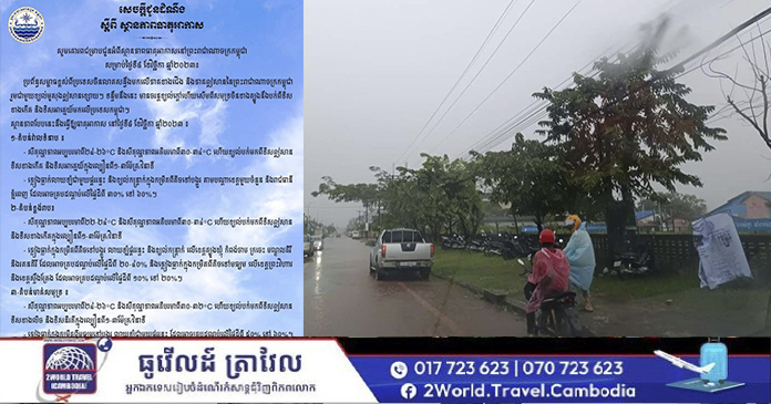 ភ្នំពេញ៖ ក្រសួងធនធានទឹកនិងឧតុនិយមបានព្យាករពីស្ថានភាពធាតុអាកាសនៅព្រះរាជាណាចក្រកម្ពុជាសម្រាប់ថ្ងៃទី៨ ខែវិច្ឆិកា ឆ្នាំ២០២៣ ៖