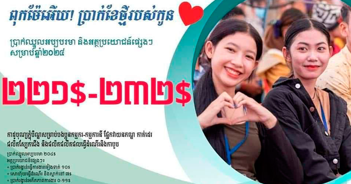 ភ្នំពេញ៖ ចាប់ពីឆ្នាំ២០២៤នេះតទៅ កម្មករកម្មការិនីទាំងអស់នឹងទទួលបានប្រាក់ឈ្នួលគោល២០៤ដុល្លារក្នុងមួយខែតាមសេចក្តីសម្រេចរបស់សម្តេចនាយករដ្ឋមន្ត្រីដែលបានបន្ថែមចំនួន២ដុល្លារលើទឹកប្រាក់២០២ដុល្លារដែលសម្រេចដោយក្រុមប្រឹក្សាជាតិប្រាក់ឈ្នួលអប្បរមាដែលបោះឆ្នោតជ្រើសរើសបន្ថែម២ដុល្លារលើប្រាក់ខែគោលចំនួន២០០ដុល្លារនៅឆ្នាំ២០២៣។