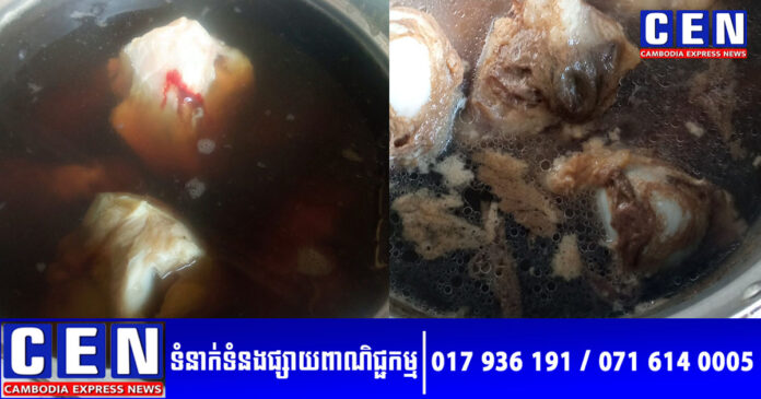 អ្នកបង្ហោះនោះបានបញ្ជាក់ថា គាត់ទិញឆ្អឹងជើងពីអ្នកលក់បោះដុំធំ។ ប៉ុន្តែ នៅពេលដាំឱ្យពុះ ស្រាប់តែទឹកប្រែជាខ្មៅ ទោះប្តូរទឹកឆ្អិន និងឆ្នាំងថ្មីហើយក៏ដោយ ក៏នៅតែចេញពណ៌ខ្មៅដដែល។ គាត់បានឲ្យដឹងថា ជាធម្មតា បើទិញពីផ្សារមកស្ងោរ ទឹកនឹងថ្លា។