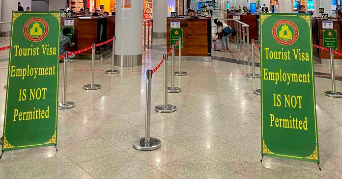 ភ្នំពេញ៖ ក្រសួងការងារ និងបណ្តុះបណ្តាលវិជ្ជាជីវៈ និងក្រសួងមហាផ្ទៃក្នុងអាណត្តិទី៧នេះបានសហការគ្នាទប់ស្កាត់បទល្មើសជួញដូរមនុស្សមកកាន់កម្ពុជាដោយការដាក់ផ្ទាំងអក្សរជាភាសាអង់គ្លេសថា “Tourist Visa, Employment is not permitted” ដែលអាចប្រែសម្រួលបានថា ទិដ្ឋាកាទេសចរណ៍មិនអនុញ្ញាតឱ្យធ្វើការនៅប្រទេសកម្ពុជាបានទេ។