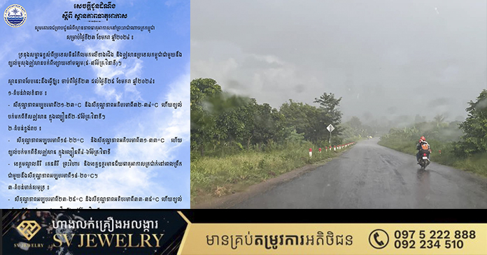 ភ្នំពេញ ៖ ក្រសួងធនធានទឹកនិងឧតុនិយម បានចេញសេចក្តីប្រកាសព័ត៌មានអំពីស្ថានភាពធាតុអាកាស នៅព្រះរាជាណាចក្រកម្ពុជាសម្រាប់ថ្ងៃទី២៣ ខែមករា ឆ្នាំ២០២៤ ថា ទ្រនុងសម្ពាធខ្ពស់ពីប្រទេសចិនរំកិលមកលើខាងជើង និង ឦសានកម្ពុជាជាមួយនឹងខ្យល់មូសុងឦសាន បក់ពីខ្សោយទៅមធ្យម(៥-៧ម៉ែត្រ/វិនាទី) ។