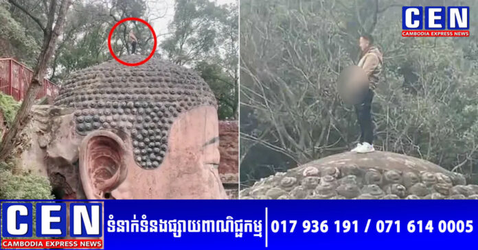 យោងតាមសេចក្តីរាយការណ៍ ហេតុការណ៍នេះបានកើតឡើងនៅឧទ្យានរូបសំណាក Maitreya Stone ប្រាសាទព្រះពុទ្ធធំ Jiazhou Lingyun នៅទីក្រុង Leshan ខេត្ត Sichuan ប្រទេសចិន។ នៅពេលនោះ មានភ្ញៀវទេសចរច្រើនមកលេង ប៉ុន្តែស្រាប់តែមានភ្ញៀវទេសចរប្រុសម្នាក់ បានឡើងលើរបង ហើយឡើងលើតំបន់ខាងលើរូបសំណាកព្រះពុទ្ធ។ បន្ទាប់មក បុរសនោះបានប្រឡេះឡេវខោ ហើយឈរបត់ជើងតូច នៅចំពោះមុខអ្នកដទៃដែលមានការតក់ស្លុត និងបានលើកទូរស័ព្ទរបស់ពួកគេដើម្បីថតវីដេអូ។