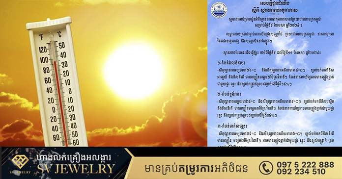 ភ្នំពេញ៖ បើយោងតាមការជូនដំណឹង របស់ក្រសួងធនធានទឹកឧតុនិយម ចាប់ពីថ្ងៃទី៩ ដល់១១មេសា ២០២៤នេះ សីតុណ្ហភាព អាចនឹងឡើងដល់ ៣៨ អង្សា នៅតំបន់វាលទំនាប និងតំបន់ខ្ពង់រាបអាចនឹងឡើងដល់ ៣៩ អង្សា ខណៈតំបន់មាត់សមុទ្រ ៣៦ អង្សា ។