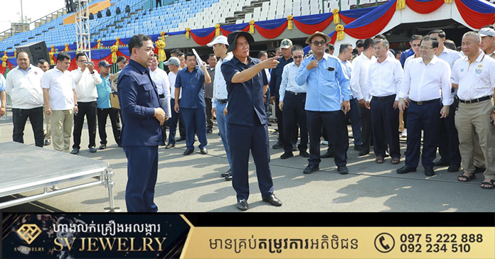 ភ្នំពេញ ៖ ឯកឧត្តម ឃួង ស្រេង អភិបាលរាជធានីភ្នំពេញនារសៀលថ្ងៃទី៣០ មេសានេះ បានដឹកនាំមន្ត្រីរដ្ឋបាលរាជធានីភ្នំពេញនិងអាជ្ញាធរខណ្ឌ៧មករា ចុះពិនិត្យទីតាំងពហុកីឡដ្ឋានជាតិអូឡាំពិក ដើម្បីត្រៀមការពារសន្តិសុខ សណ្តាប់ធ្នាប់ ក្នុងព្រឹត្តិការណ៍បាល់ទាត់មិត្តភាពសប្បុរសធម៌ ក្រោមមូលបទ រួមគ្នាដើម្បីសប្បុរសធម៌ និងប្រយុទ្ធប្រឆាំងគ្រឿងញៀន ដែលគ្រោងធ្វើឡើងនៅល្ងាចថ្ងៃទី ១ ខែឧសភា ឆ្នាំ២០២៤ស្អែកនេះ ក្រោមវត្តមានដ៏ខ្ពង់ខ្ពស់សម្តេចអគ្គមហាសេនាបតីតេជោហ៊ុន សែន អតិតៈនាយករដ្ឋមន្ត្រី អាណត្តិទី៦នៃរដ្ឋសភា និងជាប្រធានព្រឹទ្ធសភាពនៃព្រះរាជាណាចក្រកម្ពុជា។