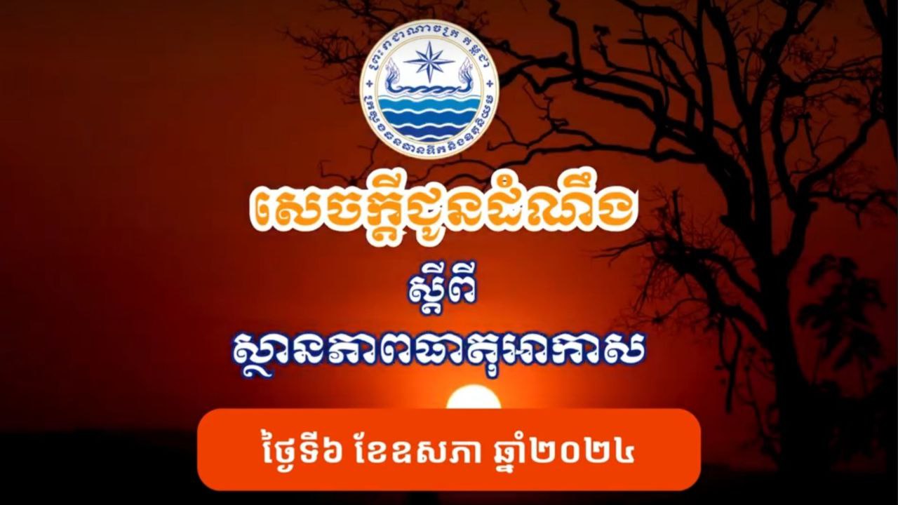 ក្រសួងបញ្ជាក់ថា សម្ពាធទាបគ្របដណ្ដប់មកលើឈូងសមុទ្រថៃ ព្រះរាជាណាចក្រកម្ពុជា ភាគកណ្តាលនៃអាងទន្លេមេគង្គ និងសមុទ្រចិនខាងត្បូង, ស្ថានភាពបែបនេះ នឹងធ្វើឱ្យ ចាប់ពីថ្ងៃទី៦ ដល់ ថ្ងៃទី៨ ខែឧសភា ឆ្នាំ២០២៤ ៖