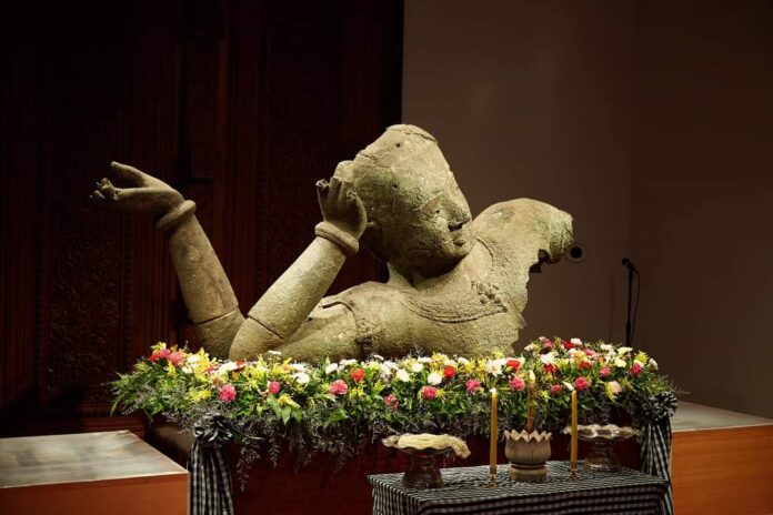 ភ្នំពេញ៖ នាព្រឹកថ្ងៃទី៧ ខែឧសភា ឆ្នាំ២០២៤ នៅសារមន្ទីរជាតិកម្ពុជា ក្រសួងវប្បធម៌ និងវិចិត្រសិល្បៈបានរៀបចំពិធីនិមន្តព្រះសង្ឃ ប្រោះព្រំសុំសេចក្តីសុខនាអំឡុងពេលនៃការវេចខ្ចប់និងដឹកជញ្ជូនប្រតិមាវិចិត្រព្រះនារាយណ៍ផ្ទុំពីសំរឹទ្ធមកពីប្រាសាទមេបុណ្យ ដើម្បីបញ្ជូនយកទៅអភិរក្ស ជួសជុល និងវិភាគស្រាវជ្រាវនៅប្រទេសបារាំង ។ ពីធិនេះប្រព្រឹត្តទៅក្រោមអធិបតីភាព លោកជំទាវបណ្ឌិតសភាចារ្យ ភឿង សកុណា រដ្ឋមន្ត្រីក្រសួងវប្បធម៌ និងវិចិត្រសិល្បៈ លោក Fabrice ETIENNE, អនុប្រធានបេសកកម្ម របស់ស្ថាទូតបារាំងប្រចាំនៅកម្ពុជា លោក Jamel OUBECHOU តំណាងលោកស្រី Yannick LINTZ នាយកសារមន្ទីជាតិសិល្បៈអាស៊ីហ្គីមេនិងលោកស្រី Elke SELTER ប្រធានកម្មវិធីនៃស្ថាប័ន ALIPH ព្រមទាំងឯកឧត្ដម លោកជំទាវតំណាងក្រសួងស្ថាប័នពាក់ព័ន្ធ។