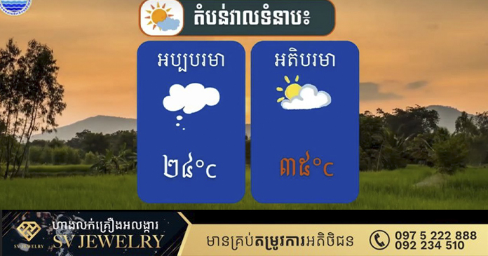 - សីតុណ្ហភាពអប្បបរមា ២៤°C និងសីតុណ្ហភាពអតិបរមា ៣៦°C។ ខ្យល់បក់មកពីទិសបស្ចិម និងទិសនិរតី មានល្បឿនមធ្យម ៣,៥ម៉ែត្រ/វិនាទី។ ខេត្តឧត្តរមានជ័យ ព្រះវិហារ ស្ទឹងត្រែង ត្បូងឃ្មំ ប៉ៃលិន កំពង់ស្ពឺ និងតំបន់ជួរភ្នំក្រវាញ អាចមានភ្លៀងធ្លាក់ជាមួយផ្គរ រន្ទះ និងខ្យល់កន្ត្រាក់ គ្របដណ្ដប់លើផ្ទៃដី១០%។