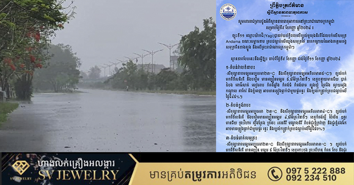 ភ្នំពេញ ៖ ក្រសួងធនធានទឹក និងឧតុនិយម បានចេញសេចក្តីជូនដំណឹង អំពីស្ថានភាពធាតុអាកាសនៅព្រះរាជាណាចក្រកម្ពុជាសម្រាប់ថ្ងៃទី៩ ខែកញ្ញាឆ្នាំ២០២៤៖ ព្យុះទី១១ ឈ្មោះយ៉ាកជី(Yagi)បានថយឥទ្ធិពលលើខ្យល់មូសុងនិរតីដែលបក់លើសមុទ្រ Andaman នៅមានឥទ្ធិពល ខណៈសម្ពាធទាប គ្របដណ្ដប់លើឈូងសមុទ្រថៃ ភាគកណ្តាលនៃអាងទន្លេមេគង្គ សមុទ្រចិនខាងត្បូង និងលើព្រះរាជាណាចក្រកម្ពុជា។
