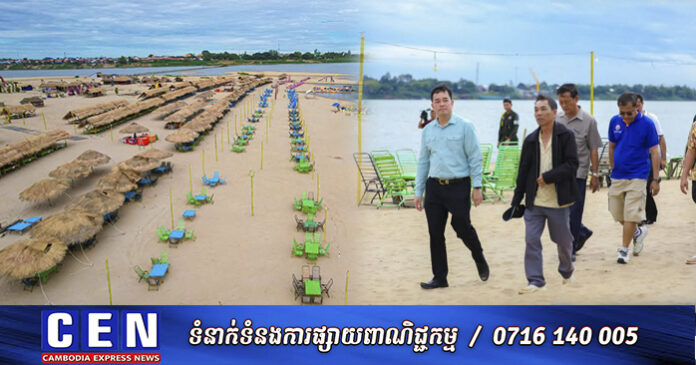 កំពង់ចាម: រដូវទឹកសម្រកគេសង្កេតឃើញក្រុមកម្មករកំពុងតែមមាញឹកដោយក្នុងដៃកាន់ញញួដំបង្គោលឬស្សីចូលទៅក្នុងដី ដើម្បីតម្លើងប្រដឹសឬស្សី ឆ្លងពីត្រើយក្រុងកំពង់ចាមឆ្ពោះទៅកាន់រមណីយដ្ឋានធម្មជាតិ “ឆ្នេរខ្សាច់កោះប៉ែន” ស្ថិតនៅឃុំកោះមិត្តស្រុកកំពង់សៀម។ជាមួយនោះគេឃើញវត្តមានឯកឧត្តមអ៊ុន ចាន់ដា អភិបាល ខេត្តអមដំណើរដោយសហការីគឺអាចចាត់ទុកជាភ្ញៀវដំបូងគេ ដែលបានអញ្ជើញដើរឆ្លងកាត់ស្ពានឬស្សីក្នុងទឹកមុខស្រស់ញញឹម ដើម្បីមកស្រូបយកខ្យល់អាកាសបរិសុទ្ធ នៅឆ្នេរខ្សាច់កោះប៉ែន។