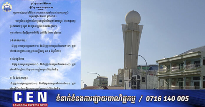 ភ្នំពេញ៖ ក្រសួងធនធានទឹក និងឧតុនិយម បានចេញសេចក្តីជូនដំណឹង អំពីស្ថានភាពធាតុអាកាសនៅកម្ពុជា សម្រាប់ថ្ងៃទី៤ ខែមករា ឆ្នាំ២០២៥។