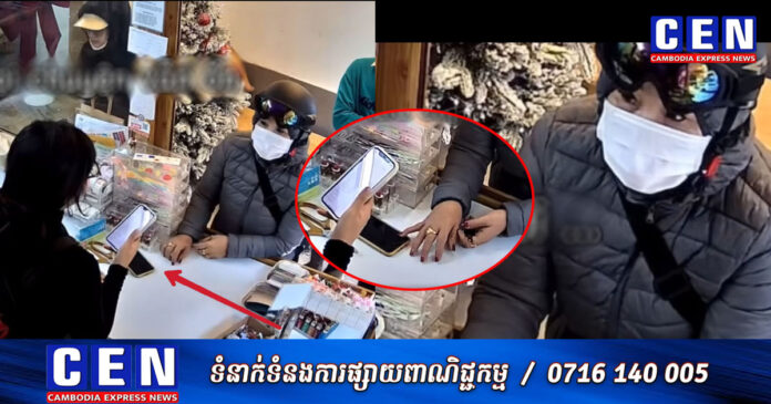 ជាក់ស្តែង នៅវេលាម៉ោងកើតហេតុ គេបានឃើញមានមនុស្សជាច្រើននៅក្នុងហាង រួមទាំងអតិថិជន និងបុគ្គលិកផងដែរ។ ប៉ុន្តែឆ្លៀតពេលបុគ្គលិកលក់កំពុងរវល់និយាយទូរស័ព្ទ មិនយកចិត្តទុកដាក់ ស្រាប់តែចោរស្រីម្នាក់ពាក់ម៉ាស អាវគ្របក្បាល និងមួកសុវត្ថិភាពឃ្លុំមុខជិត ដែលចូលហាងបន្លំខ្លួនជាអតិថិជន បានរំកិលដៃសន្សឹមៗ ទាញទូរសព្ទរបស់បុគ្គលិកហាងដែលដាក់នៅលើតុ មកជិតខ្លួន ហើយយកដាក់ក្នុងហោប៉ៅខោតែម្តង។