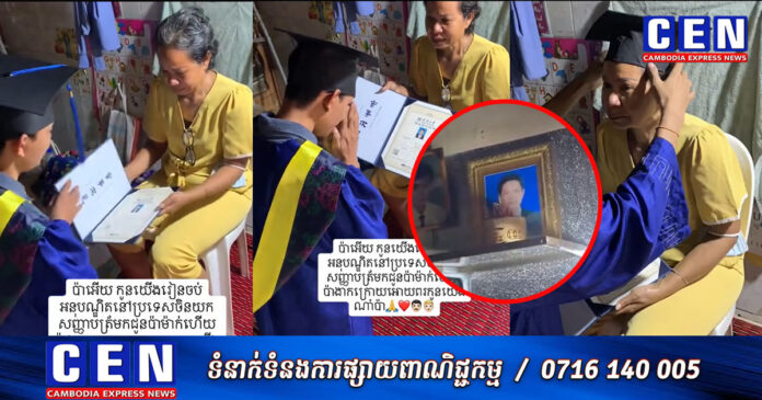 ជាក់ស្តែង តាមរយៈវីដេអូដែលត្រូវបានបង្ហោះ បានភ្ជាប់នូវពាក្យពេចន៍ស្រ្តីជាម្តាយ ដោយបានពោលពាក្យដ៏រំភើបរំជួលចិត្ត ទៅកាន់រូបថតស្វាមីដែលបានចែកឋាន យ៉ាងដូច្នេះថា «ប៉ាអើយ កូនយើងរៀនចប់អនុបណ្ឌិតនៅប្រទេសចិន កូនយកសញ្ញាប័ត្រ មកជូនប៉ាម៉ាក់ហើយ សូមប៉ាងាកក្រោយ អោយពរកូនយើងណា៎ប៉ា»។