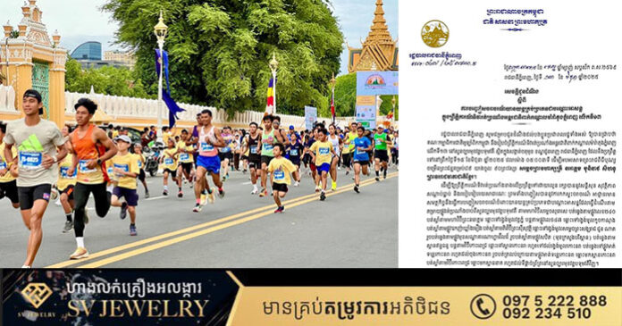 ភ្នំពេញ ៖ រដ្ឋបាលរាជធានីភ្នំពេញ សូមជម្រាបជូនដំណឹងដល់បងប្អូនប្រជាពលរដ្ឋទាំងអស់ ឱ្យបានជ្រាបថា គណៈកម្មាធិការជាតិអូឡាំពិកកម្ពុជា នឹងរៀបចំព្រឹត្តិការណ៍ទិវារត់ប្រណាំងអន្តរជាតិពាក់កណ្ដាលម៉ារ៉ាតុងភ្នំពេញ លើកទី១៣ នៅសួនច្បារមុខវត្តបទុមវតី ស្ថិតក្នុងសង្កាត់ចតុមុខ ខណ្ឌដូនពេញ រាជធានីភ្នំពេញ ដែលនឹងប្រព្រឹត្ត ទៅនៅព្រឹកថ្ងៃទី១៥ ខែមិថុនា ឆ្នាំ២០២៥ វេលាម៉ោង ០៥:០០នាទី ដើម្បីអបអរសាទរព្រះរាជពិធីបុណ្យ ចម្រើនព្រះជន្មគម្រប់៨៩ យាងចូល ៩០ព្រះវស្សា សម្តេចព្រះមហាក្សត្រី នរោត្តម មុនិនាថ សីហនុ ព្រះវររាជមាតាជាតិខ្មែរ។