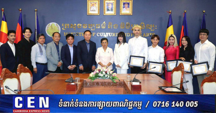 ភ្នំពេញ ៖ នាព្រឹកថ្ងៃទី០៤ ខែកញ្ញា ឆ្នាំ២០២៥ លោកជំទាវបណ្ឌិតសភាចារ្យ ភឿង សកុណា រដ្ឋមន្ត្រីក្រសួងវប្បធម៌ និងវិចិត្រសិល្បៈបានទទួលជួបលោកស្រី ទេព បូព្រឹក្ស និងក្រុមការងារ ដើម្បីសម្តែងការគួរសមនិងធ្វើបទបង្ហាញនូវវីដេអូឯកសារស្តីពីការចូលរួមរបស់លោកស្រី ដែលបានតំណាងអោយអ្នកចម្រៀងយុវវ័យកម្ពុជាសម្តែងក្នុងកម្មវិធីប្រគំតន្ត្រីនៃមហោស្រព «Round Festival »នៅទីក្រុងកូឡាឡាំពួរ ប្រទេសម៉ាឡេសុីកាលពីថ្ងៃទី២០ ដល់២២ ខែមិថុនាឆ្នាំ២០២៥នាពេលកន្លងទៅ។