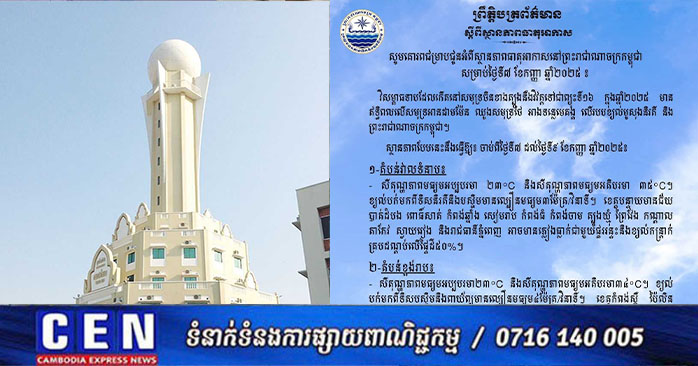ភ្នំពេញ ៖ ក្រសួងធនធានទឹកនិងឧតុនិយម បានចេញសេចក្ដីជូនដំណឹងអំពីស្ថានភាពធាតុអាកាសនៅព្រះរាជាណាចក្រកម្ពុជាសម្រាប់ថ្ងៃទី៧ ខែកញ្ញា ឆ្នាំ២០២៥៖
