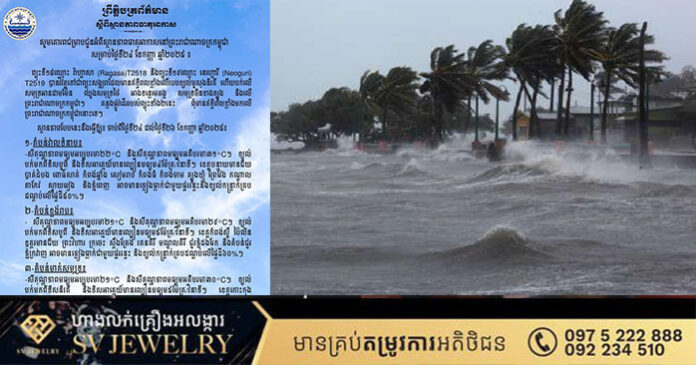 ភ្នំពេញ ៖ ក្រសួងធនធានទឹកនិងឧតុនិយម បានជម្រាបជូនអំពីស្ថានភាពធាតុអាកាសនៅព្រះរាជាណាចក្រកម្ពុជា សម្រាប់ថ្ងៃទី២៤ ខែកញ្ញា ឆ្នាំ២០២៥៖ ព្យុះទី១៨ឈ្មោះ រ៉ាហ្គាសា (Ragasa)T2518 និងព្យុះទី១៩ឈ្មោះ នេហ្គោរី (Neoguri) T2519 បានវិវត្តទៅជាព្យុះសង្ឃរាដែលមានឥទ្ធិពលខ្លាំងលើរបបខ្យល់មូសុងនិរតី ហើយបក់លើសមុទ្រអានដាមម៉ែន ឈូងសមុទ្រថៃ អាងទន្លេមេគង្គ សមុទ្រចិនខាងត្បូង និងលើព្រះរាជាណាចក្រកម្ពុជា។ គន្លងផ្លូវដើររបស់ព្យុះទាំង២នេះ ពុំមានឥទ្ធិពលខ្លាំងមកលើព្រះរាជាណាចក្រកម្ពុជានោះទេ។