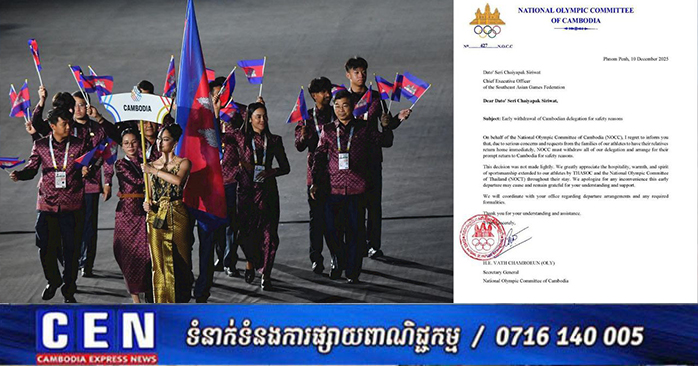 ភ្នំពេញ ៖ យោងតាមលិខិតរបស់គណៈកម្មាធិការជាតិអូឡាំពិកកម្ពុជា បានបញ្ជាក់ថាកម្ពុជា បានដកខ្លួនពីការប្រកួតកីឡស៊ីហ្គេម ២០២៥ហើយ ដោយសារបារម្ភពីសុវត្ថិភាព។