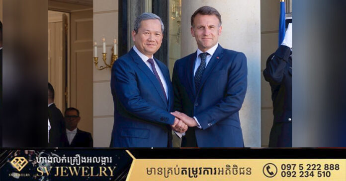 ប្រទេសបារាំង ៖ សម្តេចធិបតី ហ៊ុន ម៉ាណែតនាយករដ្ឋមន្រ្តី បានថ្លែងអរគុណចំពោះឯកឧត្តមប្រធានាធិបតី Emmanuel Macron ចំពោះការស្វាគមន៍យ៉ាងកក់ក្តៅ និងកិច្ចពិភាក្សាការងារប្រកបដោយលទ្ធផលវិជ្ជមានដើម្បីពង្រឹងចំណងមិត្តភាពទ្វេរភាគីរវាងប្រទេសយើងទាំងពីរ ជាពិសេសការរៀបចំតម្លើងកម្រិតនៃទំនាក់ទំនងរវាងកម្ពុជានិងបារាំងដល់កម្រិត “ភាពជាដៃគូរយុទ្ធសាស្ត្រ – Strategic Partnership” នៅពេលឆាប់ៗខាងមុខ។