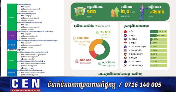គម្រោងវិនិយោគចំនួន ១៤៦ ដែលមានទុនវិនិយោគសរុបប្រមាណ ២,៥ប៊ីលានដុល្លារអាម៉េរិក ត្រូវបានចុះបញ្ជីនៅកម្ពុជា ក្នុងត្រីមាសទី១ ឆ្នាំ២០២៦។