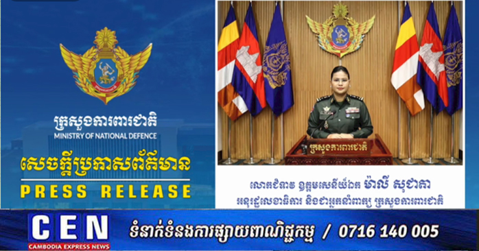 លោកជំទាវ ឧត្តមសេនីយ៍ឯក ម៉ាលី សុជាតា អ្នកនាំពាក្យក្រសួងការពារជាតិ នៃព្រះរាជាណាចក្រកម្ពុជា សូមជម្រាបជូនសាធារណជន អ្នកសារព័ត៌មានជាតិ និងអន្តរជាតិនៅថ្ងៃទី១៥ ខែមេសា ឆ្នាំ២០២៦មេត្តាជ្រាបថា៖ អ្នកនាំពាក្យក្រសួងការពារជាតិ សម្តែងនូវការខកចិត្តយ៉ាងខ្លាំង និងសូមបដិសេធចំពោះព័ត៌មានដែលបានផ្សព្វផ្សាយតាមបណ្តាញសង្គម និងសារព័ត៌មានរបស់ថៃជាបន្តបន្ទាប់ ដែលថា «កម្ពុជាស្នើឱ្យបើកច្រកដឹកជញ្ជូនទំនិញសង្គ្រោះបន្ទាន់» ដោយនេះជាព័ត៌មានក្លែងក្លាយ និងផ្ទុយពីការពិតក្នុងចេតនា ដើម្បីបង្កការបំភ័ន្តសាធារណមតិជាតិ និងអន្តរជាតិ។
