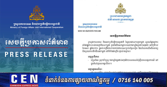 រាជធានីភ្នំពេញ ៖ នៅថ្ងៃទី១៩ ខែមេសា ឆ្នាំ២០២៦ក្រសួងការបរទេស និងសហប្រតិបត្តិការអន្តរជាតិ នៃព្រះរាជាណាចក្រកម្ពុជា សូមសម្តែងនូវការ តវ៉ាជាផ្លូវការរបស់រាជរដ្ឋាភិបាលកម្ពុជា ប្រឆាំងនឹងសកម្មភាពរបស់កងកម្លាំងប្រដាប់អាវុធថៃ នៅថ្ងៃទី១៨ ខែមេសា ឆ្នាំ២០២៦ ក្នុងការពង្រឹងការកាន់កាប់ដោយខុសច្បាប់បន្ថែមទៀត ដែលរំលោភលើអធិបតេយ្យ និងបូរណភាពទឹកដីរបស់កម្ពុជា នៅទីតាំងជាច្រើន ដូចខាងក្រោម៖
