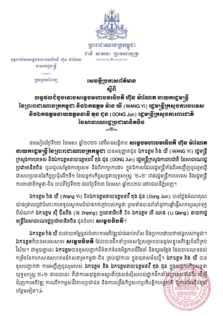 ភ្នំពេញ ៖ នារសៀលថ្ងៃទី២២ ខែមេសា ឆ្នាំ២០២៦ នៅវិមានសន្តិភាព, សម្ដេចមហាបវរធិបតី ហ៊ុន ម៉ាណែត នាយករដ្ឋមន្ត្រីនៃព្រះរាជាណាចក្រកម្ពុជា បានអនុញ្ញាតជូន ឯកឧត្តម វ៉ាង យី (WANG Yi) រដ្ឋមន្ត្រីក្រសួងការបរទេស និងឯកឧត្តមនាយឧត្តមនាវី តុង ជុន (DONG Jun) រដ្ឋមន្ត្រីក្រសួងការពារជាតិ នៃសាធារណរដ្ឋប្រជាមានិតចិន ចូលជួបសម្តែងការគួរសម និងពិភាក្សាការងារ ក្នុងឱកាសដែលរដ្ឋមន្ត្រីទាំងពីរអញ្ជើញចូលរួមធ្វើជាសហប្រធាននៃកិច្ចប្រជុំលើកទី១ នៃយន្តការកិច្ចសន្ទនាយុទ្ធសាស្ត្រ “២+២” រវាងរដ្ឋមន្ត្រីការបរទេស និងរដ្ឋមន្ត្រីការពារជាតិកម្ពុជា-ចិន ចាប់ពីថ្ងៃទី២២ ដល់ថ្ងៃទី២៣ ខែមេសា ឆ្នាំ២០២៦ នៅរាជធានីភ្នំពេញ។